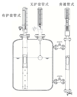 ◆在容器從不適宜側(cè)面開孔及容器周圍空間很少時(shí),可在容器上部或下部安排本形式的液位計(jì)。