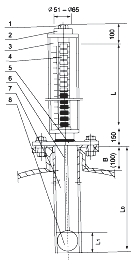 | B:貯藏接口頸高 L:量程范圍 L1:盲區(qū) L0:最大插入深度 1、排空絲堵 2、主體管 3、顯示器 4、磁性翻柱 5、連接法蘭 6、頂桿 7、護(hù)導(dǎo)管 8、浮球組件 |