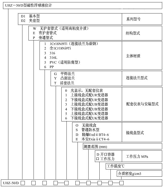 UHZ-50/D型系列頂裝式磁性浮球液位計(jì)常用規(guī)格型號