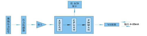 儀表通過溫度傳感器把溫度信號(hào)變?yōu)殡娦盘?hào),再由前置放大器把些電信號(hào)放大濾波,送往CPU的A/D轉(zhuǎn)換模塊進(jìn)行模擬量到數(shù)字量的變換。最后由CPU進(jìn)行數(shù)據(jù)處理并顯示PWM輸出。