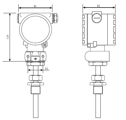 連接,溫度傳感器長度為100mm,鋁合金外殼無現(xiàn)場指示,防護(hù)等級(jí)IP65,測量范圍0~600℃。