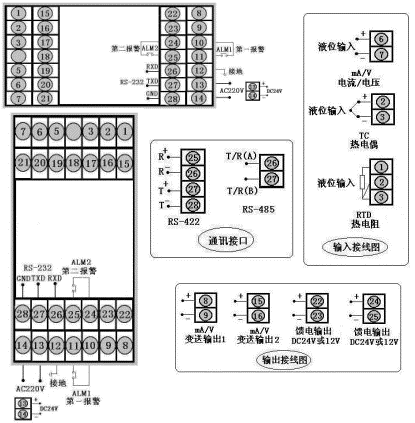 帶控制(或報(bào)警)輸出液位容積控制儀,輸入類型為4~20mA,繼電器控制輸出,帶RS-485通訊,帶上下限繼電器報(bào)警輸出,帶DC24V饋電輸出。