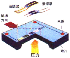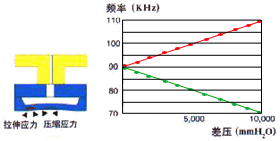 采用微電子加工技術(shù)(MEMS)在一個(gè)單晶硅芯片表面的中心和邊緣制作 兩個(gè)形狀、尺寸、材質(zhì)完全一致的H形狀的諧振梁,諧振梁在自激振蕩 回路中作高頻振蕩(如圖1)。 單晶硅片的上下表面受到的壓力不等時(shí),將產(chǎn)生形變,導(dǎo)致中心諧振梁 因壓縮力而頻率減小,邊緣諧振因受拉伸力而頻率增加(如圖2)。