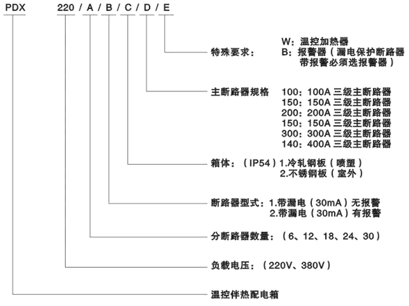 PDX配電箱是用于伴熱電纜電伴熱的標準配電箱,采用掛式活落地式箱體結(jié)構(gòu),電源電纜進口在箱體底部,防護等級IP54,內(nèi)裝有主斷路器。分路漏電保護斷路器,也可根據(jù)特別需要,配報警裝置及溫控器。1、標準箱