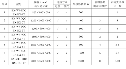 示例:BWF—10G—T表示箱體尺寸為1500X600X2000(長X寬X高),有觀察窗,采用電伴熱的保溫箱,可安裝變送器10臺,且附設(shè)有管路伴熱電源。