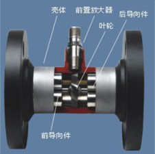 圖1所示為渦輪流量傳感器結(jié)構(gòu)簡(jiǎn)圖,由圖可見(jiàn),當(dāng)被測(cè)流體流過(guò)傳感器時(shí),在流體作用下,葉輪受力旋轉(zhuǎn),其轉(zhuǎn)速與管道平均流速成正比,葉輪的轉(zhuǎn)動(dòng)周期地改變磁電轉(zhuǎn)換器的磁阻值。檢測(cè)線(xiàn)圈中的磁通道隨之發(fā)生周期性變化,產(chǎn)生周期性的感應(yīng)電勢(shì),即電脈沖信號(hào),經(jīng)放大器放大后,送至顯示儀表顯示。