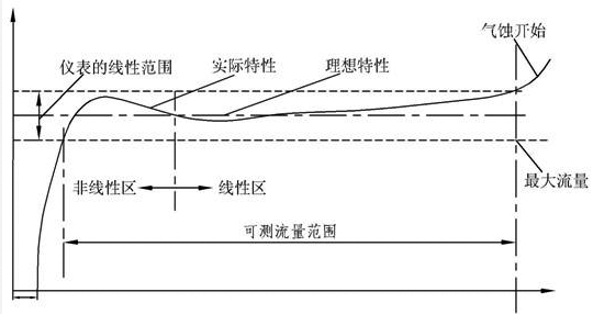流量計(jì)的系數(shù)與流量(或管道雷諾數(shù))的關(guān)系曲線(xiàn)如圖2所示。由圖可見(jiàn),儀表系數(shù)可分為兩段,即線(xiàn)性段和非線(xiàn)性段。線(xiàn)性段約為其工作段的三分之二,其特性與傳感器結(jié)構(gòu)尺寸及流體粘性有關(guān)。在非線(xiàn)性段,特性受軸承摩擦力,流體粘性阻力影響較大。當(dāng)流量低于傳感器流量下限時(shí),儀表系數(shù)隨著流量迅速變化。壓力損失與流量近似為平方關(guān)系。當(dāng)流量超過(guò)流量上限時(shí)要注意防止空穴現(xiàn)象。結(jié)構(gòu)相似的TUF特性曲線(xiàn)的形狀是相似的,它僅在系統(tǒng)誤差水平方面有所不同。