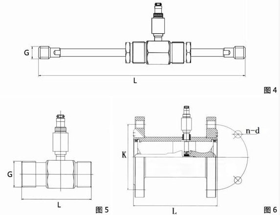 傳感器的安裝方式根據(jù)規(guī)格不同,采用螺紋或法蘭連接,安裝方式見(jiàn)圖4、圖5、圖6,安裝尺寸見(jiàn)表4。