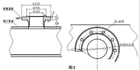 在第一次安裝時,如果被測管道允許斷流,可按照安裝基座示意圖(圖3),在被測管道上滿足直管段長度要求的位置開一個Φ100孔,完成“安裝基座”與管道的連接。然后按照安裝示意圖(圖2)完成全部安裝工作。也可以安裝球閥后暫時關(guān)閉球閥,以不影響管道輸送流體,待以后再安裝傳感器。