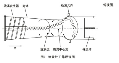 當(dāng)流體通過螺旋形導(dǎo)流葉片組成的旋渦發(fā)生體后,流體被強(qiáng)迫繞旋渦發(fā)生體中心劇烈地旋轉(zhuǎn),形成旋渦流。旋渦流加速,沿流動(dòng)方向經(jīng)縮徑段,流動(dòng)強(qiáng)度增強(qiáng)。當(dāng)旋渦流進(jìn)入擴(kuò)散段后,在導(dǎo)流體回流的作用下,該旋渦產(chǎn)生二次旋轉(zhuǎn)運(yùn)動(dòng),即旋渦進(jìn)動(dòng)。二次旋渦進(jìn)動(dòng)的頻率與流量成正比。當(dāng)流量計(jì)設(shè)計(jì)得當(dāng)時(shí),在很寬的流量范圍內(nèi),旋渦的頻率與流量成線性關(guān)系。該頻率由壓電傳感器檢測(cè),由流量積算儀進(jìn)行運(yùn)算和處理。