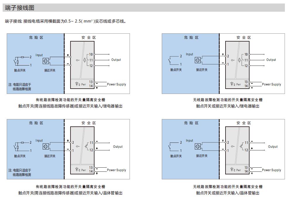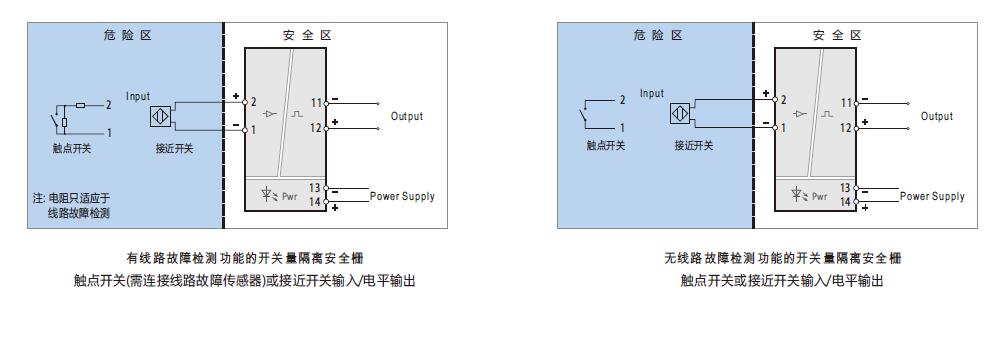 (說明: 當用到線路檢測功能時,如果需要使用機械觸點開關(guān)作為輸入設(shè)備,必須在輸入回路中連接線路故障傳感器,以避免開關(guān)量隔離安全柵將機械觸點開關(guān)正常的通斷誤當做輸入回路的斷路或短路故障。)