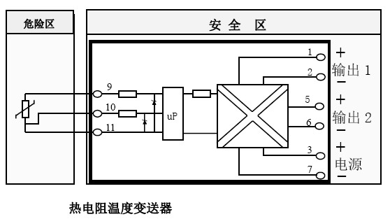2. 熱電阻溫度變送器通往現(xiàn)場(危險場所)的軟銅導線截面積必須大于0.5mm2。