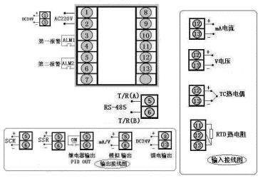 智能溫控器,無通訊,變送輸出和PID控制輸出為4-20mA,輸入信號(hào)為k型熱電偶,儀表帶上、下限報(bào)警輸出,儀表電
