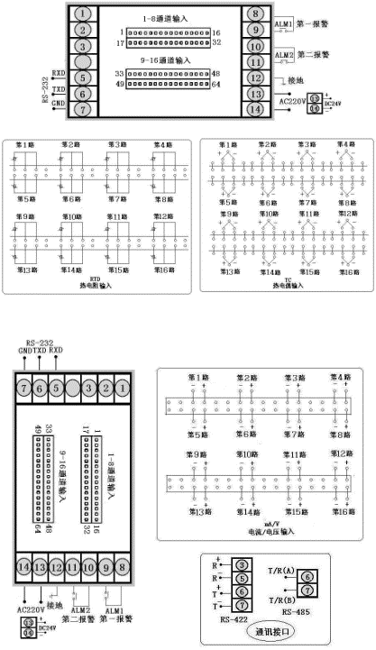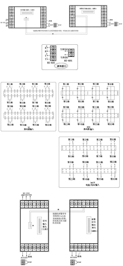 | 八路巡檢分別控制/報(bào)警輸出,通訊方式為RS-485,輸出方式為繼電器輸入,輸入類型為Cu50,第一報(bào)警為下限報(bào)警,第二報(bào)警為上限報(bào)警,AC90~265V供電(開關(guān)電源),橫表。 |