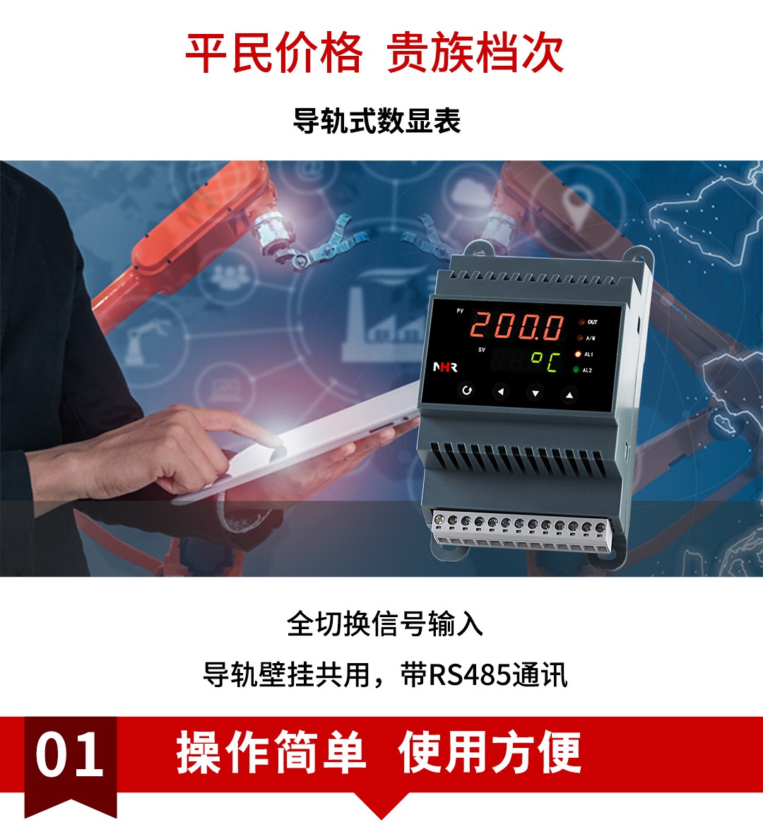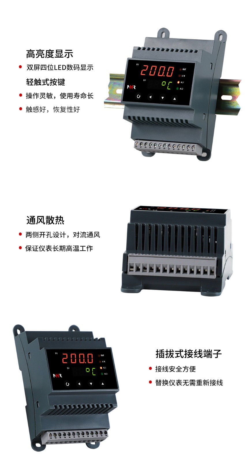 NHR-DN10系列導(dǎo)軌式數(shù)字顯示控制儀采用了表面貼裝工藝,全自動(dòng)貼片機(jī)生產(chǎn),具有很強(qiáng)的抗干擾能力??蓪?duì)溫度、壓力、液位等工業(yè)過(guò)程參數(shù)進(jìn)行測(cè)量、顯示、報(bào)警控制、變送輸出、數(shù)據(jù)采集及通訊。