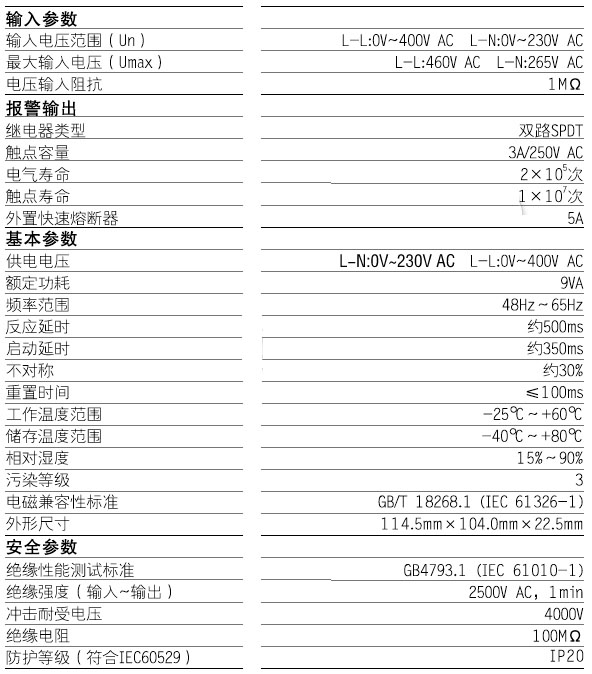 相序監(jiān)控繼電器 | ETM-PH-400 | 相序故障、缺相 | L-L:0~400V/L-N:0~230V AC | 從被測系統(tǒng)取電 |