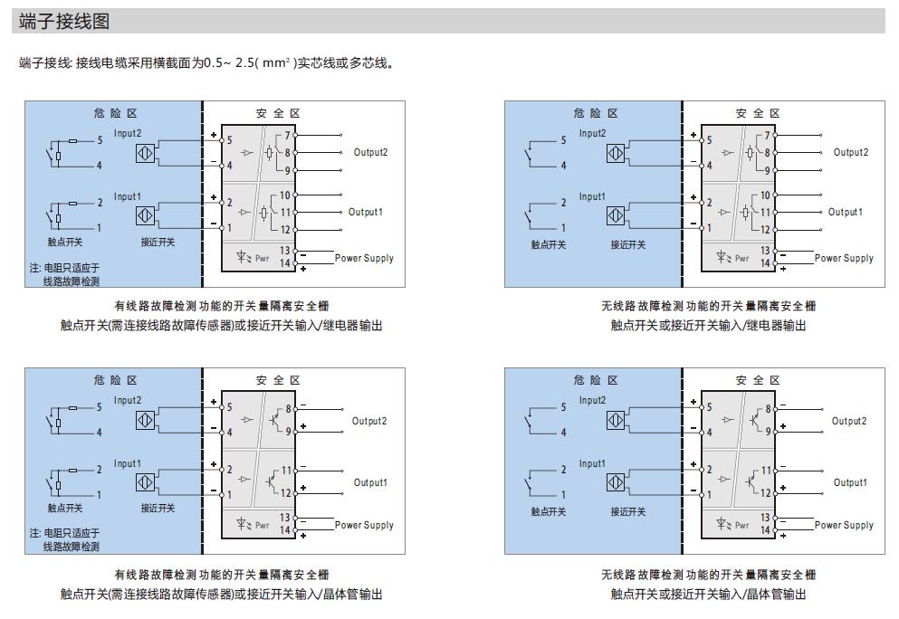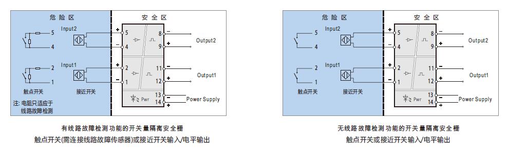 (說明: 當用到線路檢測功能時,如果需要使用機械觸點開關(guān)作為輸入設備,必須在輸入回路中連接線路故障傳感器,以避免開關(guān)量隔離安全柵將機械觸點開關(guān)正常的通斷誤當做輸入回路的斷路或短路故障。)