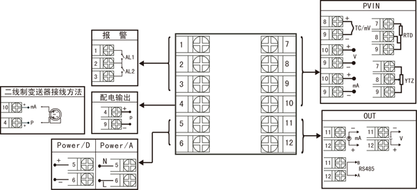 | X 0 1 2 3 4 5 D1 | 無輸出 4-20mA(RL≤600Ω) 1-5V(RL≥250KΩ) 0-10mA(RL≤1.2Ω) 0-5V(RL≥250KΩ) 0-20mA(RL≤600Ω) 0-10V(RL≥4KΩ) RS-485通迅接口(Modbus) | ||