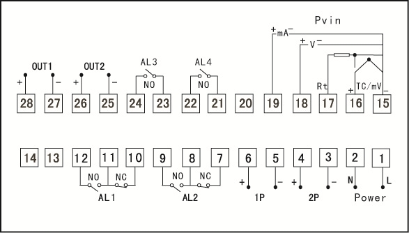 | 1、選型時請根據接線圖來選擇功能,由于尺寸小的儀表接線端子少帶不了全功能,有的功能在同組端子上只能選擇其中一種功能。 2、在寫型號時必須完整,沒有選到的功能項不能省略,必須用“X”補上。 例1:NHR-5910-55-0/X/2/1P(24)-A。 |