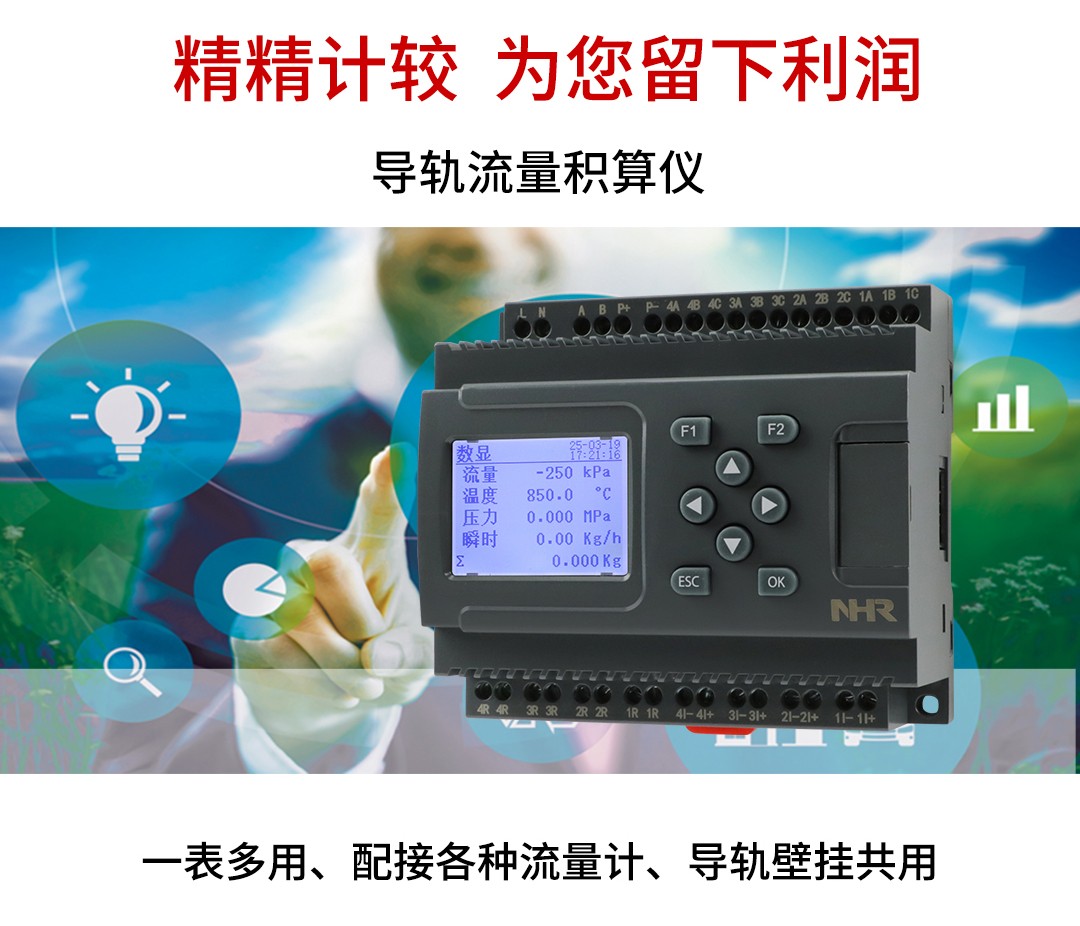 NHR-DN60系列導(dǎo)軌流量積算儀接收來(lái)自流量傳感器信號(hào)(差壓、脈沖等)、溫度、壓力傳感器的補(bǔ)償信 號(hào)實(shí)現(xiàn)對(duì)氣體、熱水和蒸汽流量進(jìn)行過(guò)程監(jiān)測(cè),總量累積及定量控制。