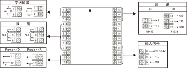 | X 1 2 | 無輸出 1路報(bào)警 2路報(bào)警 | X D1 D2 | 無接口 RS-485通訊接口 RS-232通訊接口 |